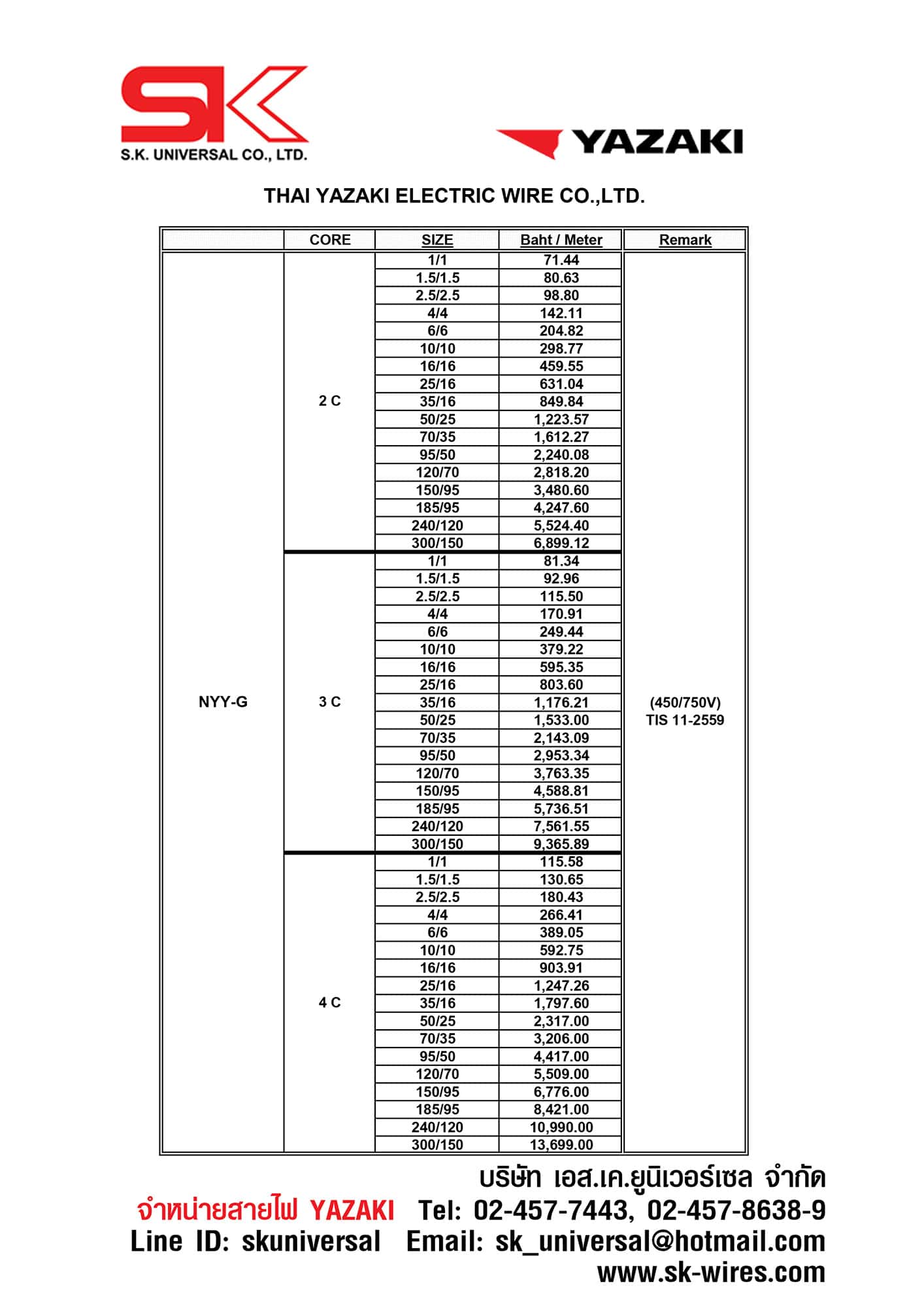 ราคาตั้ง สายไฟ NYY-G Thai Yazaki (Price List)
